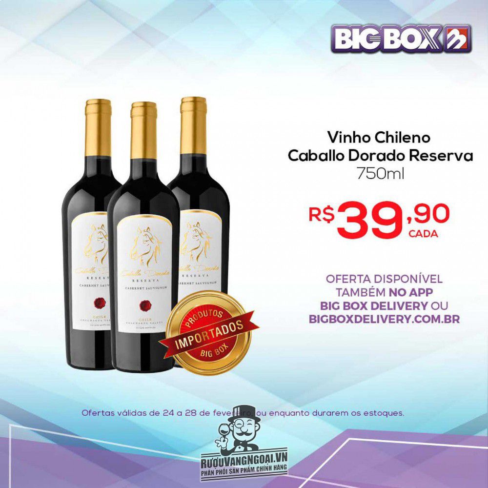 Hãy nhanh tay chớp lấy cơ hội mua được Vang Chile Caballo Dorado Reserva Cabernet Sauvignon xuất sắc nhất với mức giá ưu đãi đặc biệt, bên cạnh đó chúng tôi luôn luôn chạy các chương trình ưu đãi cực sâu giúp quý khách có thể lựa chọn những chai vang đẳng cấp với giá hời. rượu vang ngon không chỉ là một đồ uống mà còn là một phần quan trọng trong các buổi gặp gỡ bạn bè đặc biệt.