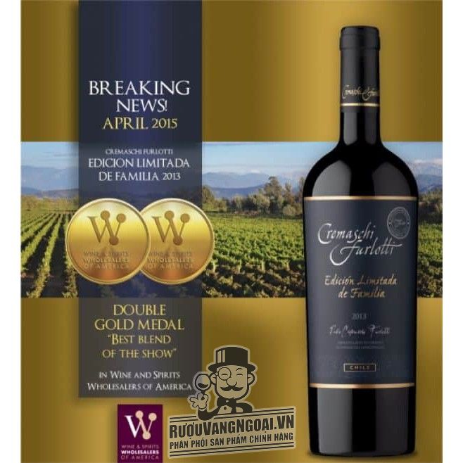 Rượu vang ngoại tự hào là đối tác cung cấp rượu vang quà tặng doanh nghiệp hàng đầu tại Việt Nam. Chúng tôi Chuyên rượu vang nhập khẩu chính hãng giao hàng toàn quốc, mang đến cho quý khách những chai vang nhập khẩu chính hãng. Bạn đang săn lùng cung cấp rượu vang giá sỉ thì ruouvangngoai.vn chính là lựa chọn tuyệt vời dành cho bạn. Với hương vị thơm ngon Vang Chile CREMASCHI FURLOTTI Limited Edition de Familia là sự kết hợp hoàn hảo giữa các giống nho Blend chất lượng cao được tuyển chọn kỹ lưỡng từ những vùng sản xuất rượu vang Maule Valley nổi tiếng thế giới, mỗi chai vang mang trong mình một câu chuyện về sự tinh túy của đất trời, mang đến cho người thưởng thức trải nghiệm khó quên. Vang Chile CREMASCHI FURLOTTI Limited Edition de Familia chính là lựa chọn không thể bỏ qua dành cho bạn, cho những dịp đặc biệt như tiệc tùng cùng đối tác. Hiện tại chai rượu này đang được bán giá cực kỳ ưu đãi chỉ còn 635.000 VNĐ, kèm theo ưu đãi đặc biệt tặng kèm dụng cụ mở rượu cho đơn hàng từ 3 chai trở lên, đặc biệt chính sách mua 3 tặng 1 vô cùng hấp dẫn cho đơn hàng đầu tiên, hãy liên hệ 0983852992 để mua với giá rẻ hơn nữa. Ruouvangngoai.vn cam kết mang đến cho bạn những chai vang cao cấp với mức giá thấp hơn so với các nơi khác. Bên cạnh đó ruou vang ngoai còn có các chương trình khuyến mại đặc biệt, giúp bạn sở hữu các sản phẩm chất lượng với giá cực tốt.