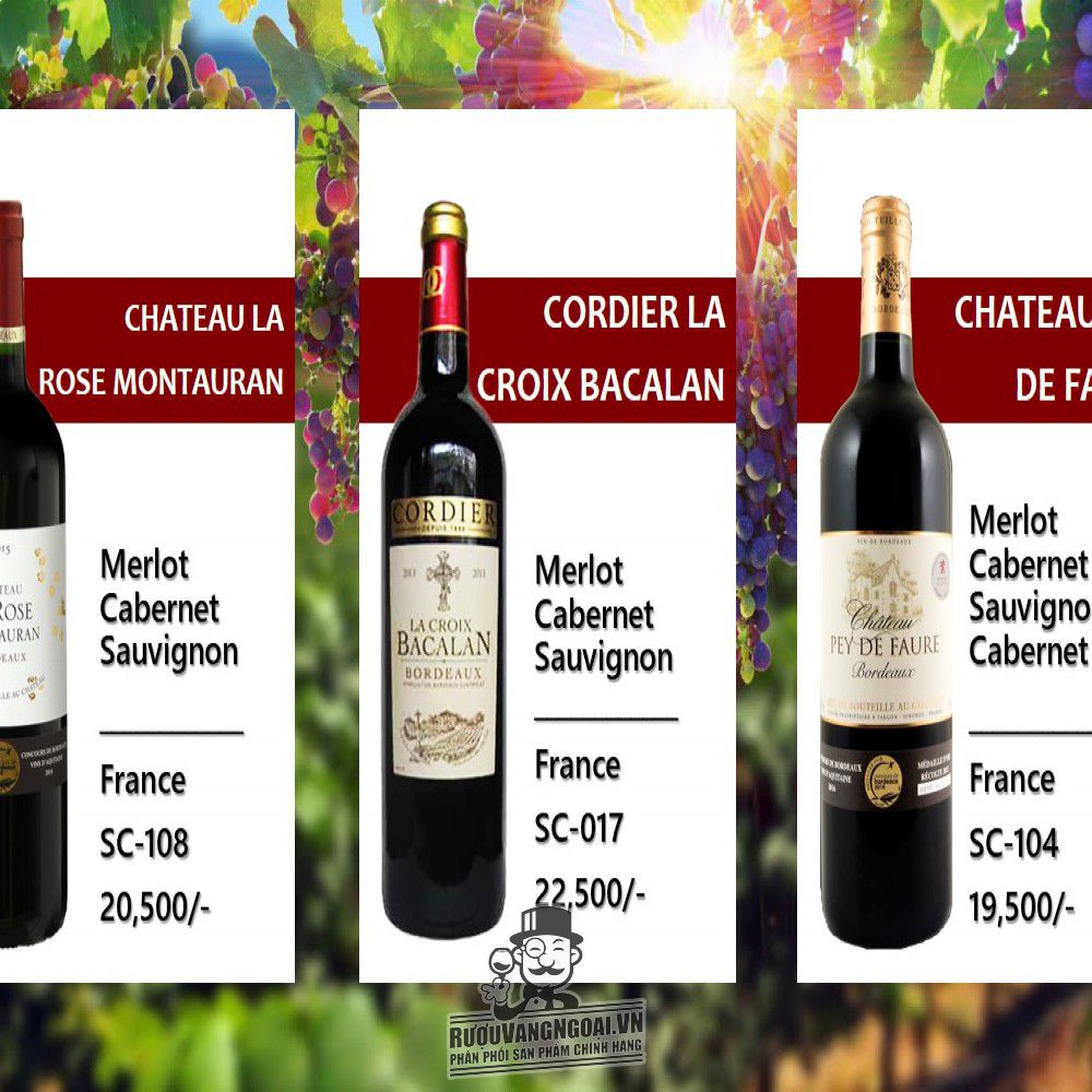 Dòng rượu Vang đỏ - trắng cao cấp, xuất xứ từ Pháp, được làm từ giống nho Cabernet Franc - Cabernet Sauvignon - Merlot, với nồng độ 13%