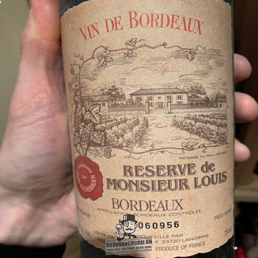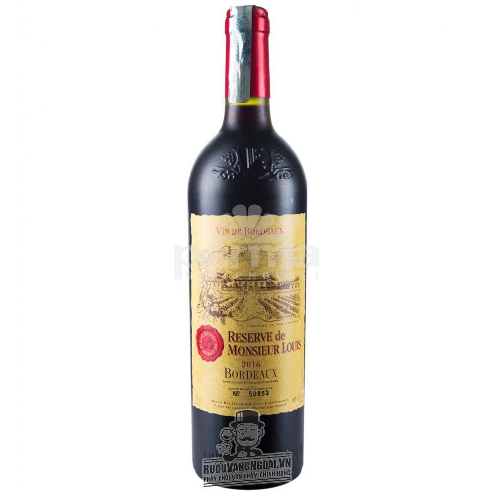 Dòng Vang đỏ là một trong những chai vang thượng hạng. Vang Pháp Monsieur Louis Bordeaux uống ngon là chai rượu vang nho phù hợp các bữa tiệc sang trọng. Sử dụng giống nho Blend làm nền hương vị. Xuất xứ từ tại , Pháp. Dung tích 750ml với nồng độ 12% dễ thưởng thức.
